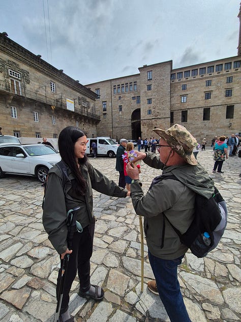 A group of joyful pilgrims cheer us on loudly as we’re paces away from Santiago Cathedral.